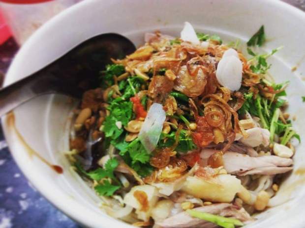 Ngồi nhìn cái bát phở trộn trước mặt: nước trộn đằm vị, hơi ngậy, thịt gà cũng mướt mềm, rau tươi, bánh phở không bị nát, thích the the thì vẩy tí tiêu ớt, rắc thêm nhúm lạc với hành phi thơm lựng. Khua một hơi hết bát 🙂 xong thấm giọng bát nước dùng hãy còn nóng bỏng, tôi cứ bụng bảo dạ: “Thế này thôi, chẳng cần đi đâu xa“.